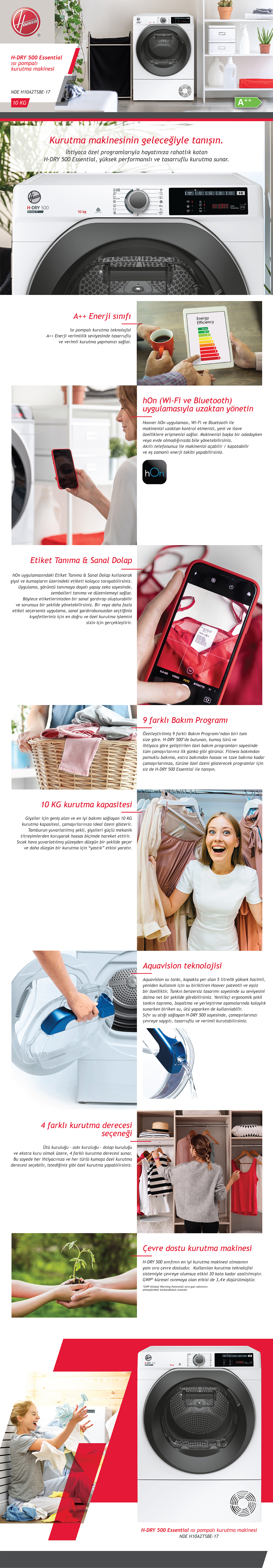 Hoover NDEH 10A2TSBE-17 10 kg Wi-Fi + Bluetooth Bağlantılı Isı Pompalı Kurutma Makinesi Gelişmiş teknolojiyi takip eden türden bir kurutma makinesi olarak Hoover NDEH 10A2TSBE-17 serisi üstün performansı ile dikkat çeker. Çevre dostu bir kurutma olanağı sunan kurutma makinesinin toplam kapasitesi 10 kilogram olarak belirtilir. Giysileriniz için geniş bir alan sunması açısından Hoover ısı pompalı kurutma makinesini rahatlıkla tercih edebilirsiniz. İhtiyaçlarınıza ve kumaş türüne bağlı olarak kurutma programlarını ayarlayabilir, zamandan ve elektrikten tasarruf edebilirsiniz. Özel bakım programları da bulunduran kurutma makinesi kıyafetlerin ilk günkü kalitede görünmesini sağlar. Fitness bakım, pamuklu bakım, extra bakım ve hassas ve taze bakım gibi bakım ayarlamaları bulunur. Tüm programların kolayca kullanılabilmesi için kurutma makinesi üzerinde anlaşılır semboller ile tuşlar yer alır. Ayrıca evden uzaktayken ya da farklı bir odadayken de akıllı cihazlarınız üzerinden kurutma makinesini kontrol edebilirsiniz. Hoover markasının uygulaması olan hOn’u cihazınıza yüklediğinizde Wi – Fi ya da Bluetooth bağlantısı ile makinenizi kontrol etmeye başlayabilirsiniz. Yeni Nesil ve Çevre Dostu Kurutma İçerdiği fonksiyonları bakımından Hoover NDEH 10A2TSBE-17 model kurutma makinesi çevre dostu bir ürün olarak nitelendirilebilir. H-DRY 500 sınıfında bulunan kurutma makinesi çevreye verilen olumsuz etkinin 30 kat kadar azaltılmış hali ile çalışma gerçekleştirir. Bununla birlikte GWP küresel ısınma kapsamında oluşan etki oranı ise 3,4’e kadar düşer. Ayrıca 4 farklı kurutma derecesi alternatifi sunulması da kolay ve portatif bir kullanım sağlar. Askı kuruluğu, ütü kuruluğu, ekstra kuru ve dolap kuruluğu olarak farklı kurutma dereceleri yer alır. Farklı kumaş türlerine ve özel kurutma derecelerine dikkat edilerek Hoover NDEH 10A2TSBE-17 teknolojisi profesyonel bir kurutma süreci gerçekleştirir. Vaktiniz olmayan dönemlerde de hızlı bir kurutma programı ayarlayarak kısa sürede istediğiniz kurutma ayarında temiz giysilerinizi alabilirsiniz. Kapsamış olduğu niteliklerinin yanı sıra Hoover NDEH 10A2TSBE-17 ısı pompalı kurutma makinelerinde Aquavision teknolojisi tercih edilir. Su tankında biriken su daha sonrasında ütü yapmak veya çiçek sulamak gibi alternatif uygulamalarda kullanıma uygundur. Aynı zamanda makinenin su tankında biriken suyun net miktarını her daim görebilmeniz de mümkündür. Çevreye saygılı bir çalışma prensibi sergileyen Hoover NDEH 10A2TSBE-17 kurutma makinesi bu bağlamda yoğun bir ilgi ile karşılanır. Teknik Özellikler